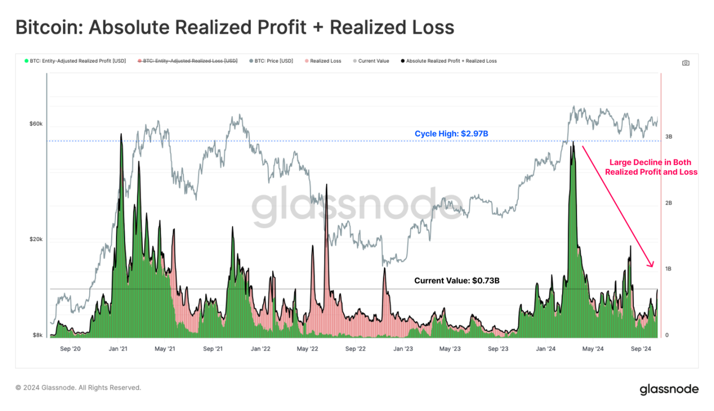 从中长周期来看,目前比特币市场的绝对已实现利润与亏损均呈现显著下降趋势。自 2024 年 3 月比特币达到 7.3 万美元的历史高点后,新资本流入市场的速度显著减缓。根据 Glassnode 提供的数据显示,目前日流入市场的资本约为 7.3 亿美元,尽管这一数字仍不算小,但与 3 月份高峰时的 29.7 亿美元相比,下降幅度非常明显。