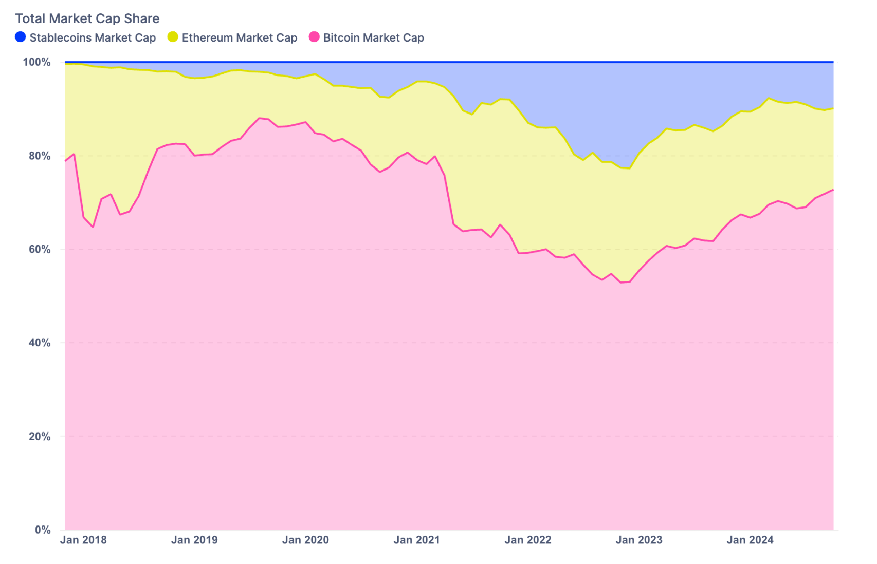 根据历史数据,牛市周期的初期通常伴随着比特币的市占率上升,而当市场进入山寨币的「Altcoin Season」时,比特币的市占率通常会下降。同时,比特币市占率达到高点时,市场往往进入横盘整理或回调阶段。理论上,这是市场流动性和投资情绪达到临界点的表现,是由于比特币吸引了大量资金流入后,价格达到较高水平,市场开始获利了结的自然结果。