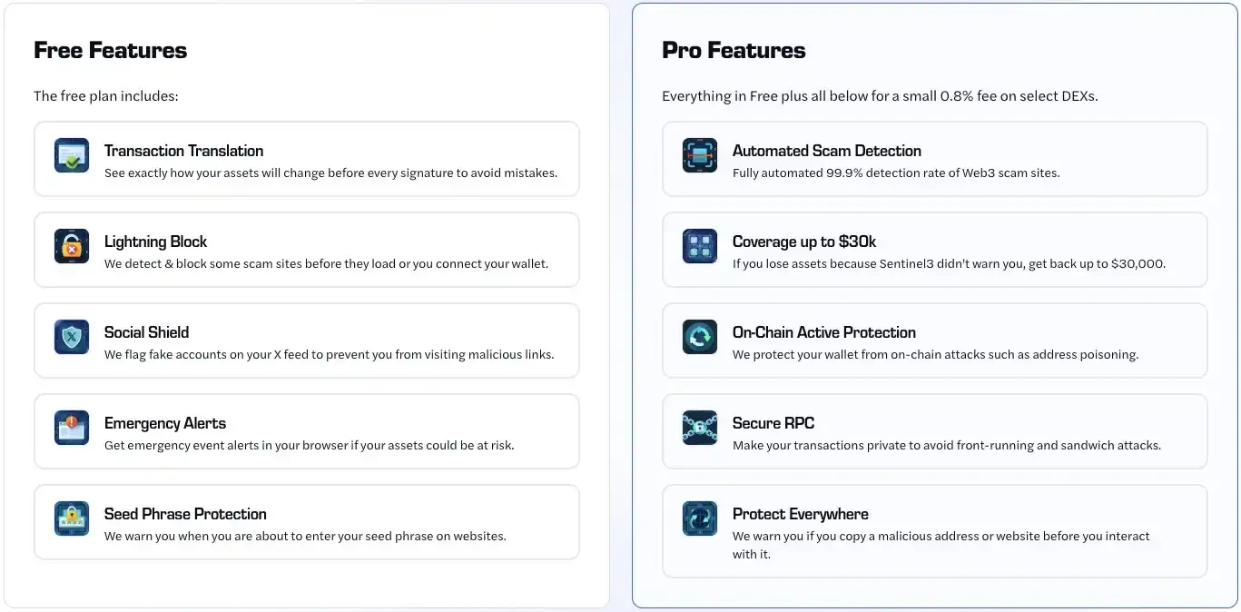 就 Sentine l3 来说,并不是所有用户都有理赔资格。Sentine l3 的产品服务分为免费版和付费版,付费版即需要支付 0.8% 的固定费用,功能包括理赔资格、RPC 服务、防地址污染等。