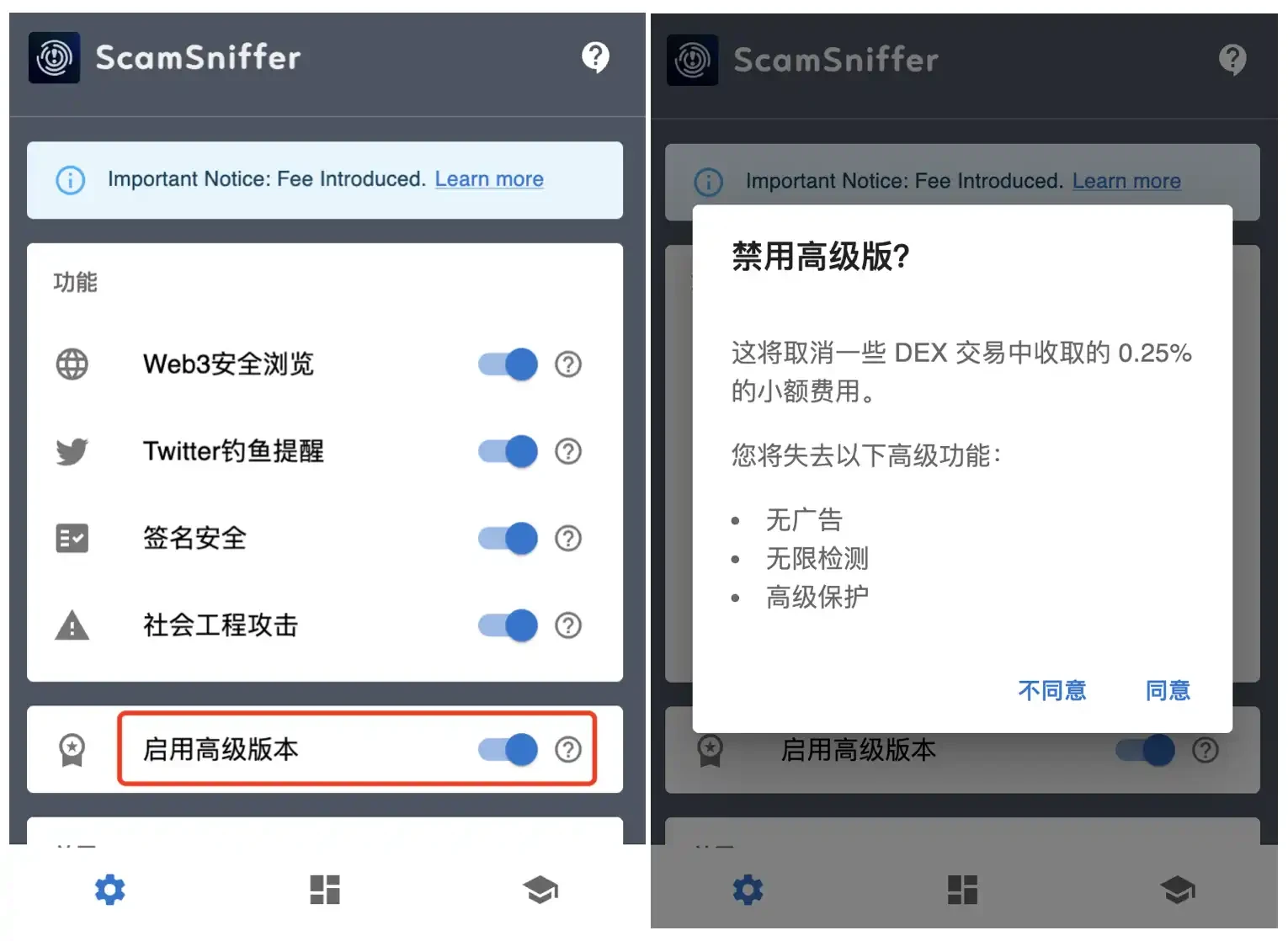 在查阅插件界面及官网后,BlockBeats 记者发现 Scam Sniffer 官方已设置费用通知横幅且文档更新介绍了费用扣除细节。此外,插件的免费版本默认启用了高级功能,这也引发了用户质疑。