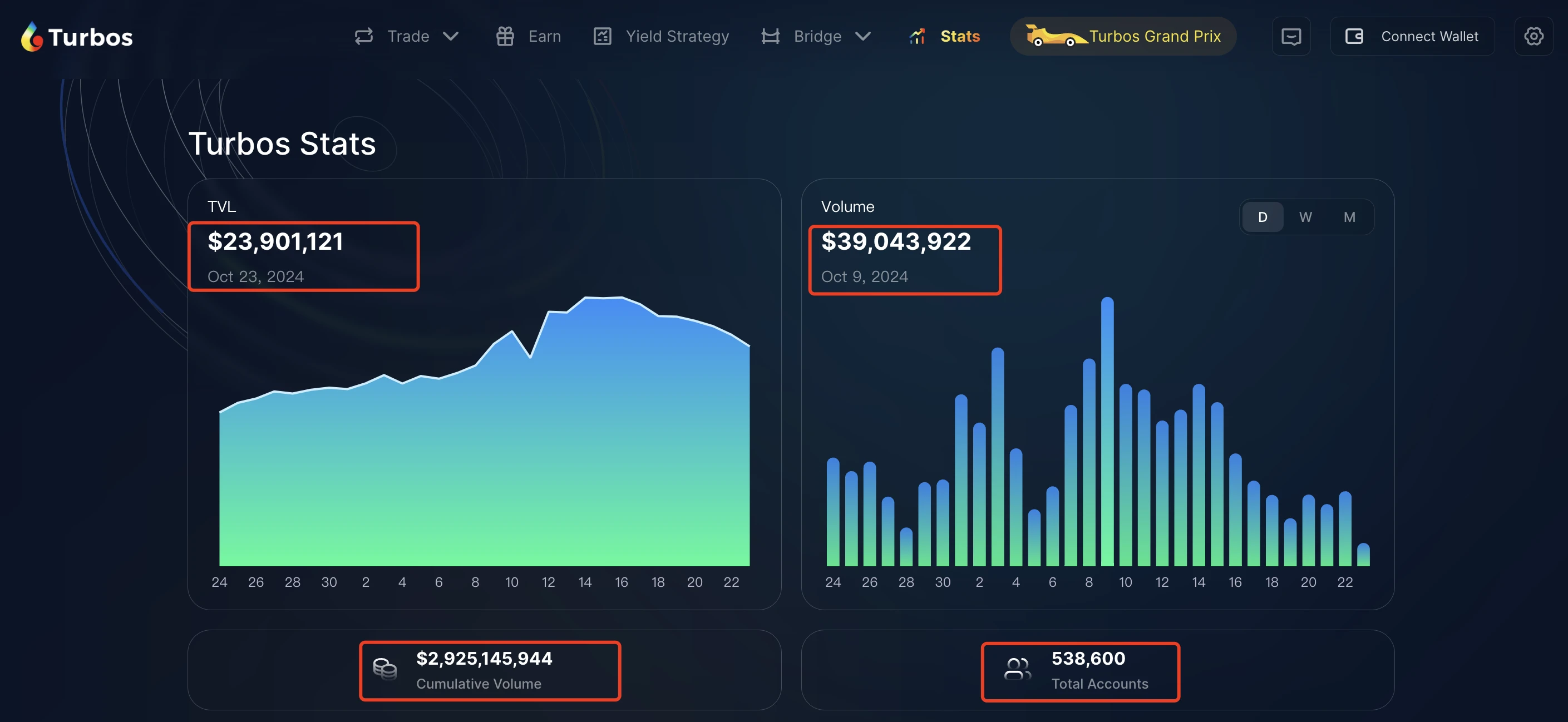 据 官方网站信息 ,其日交易量曾于 10 月 9 日 突破 3900 万美元 ,创历史新高; 10 月 14 日 ,其 TVL 突破超 3000 万美元,总账户数突破 40 万,累计交易量超 28 亿美元;最新数据,其 TVL 已稳定在 2390 万美元左右。得益于一系列优秀的市场表现,其平台代币 TURBOS(Turbos Finance)曾于 10 月 12 日创下 单日涨幅 15.7% 的增长。