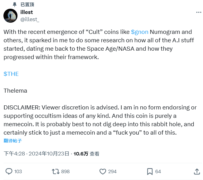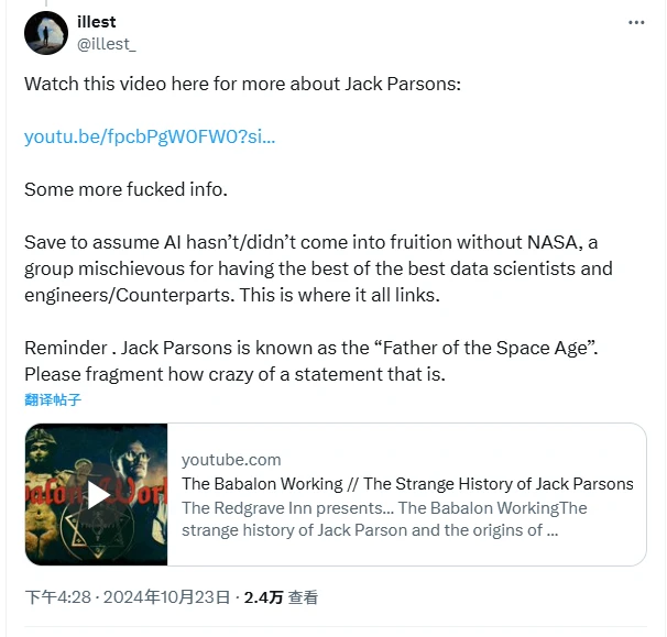 这个 illest 在推文中东扯西聊说了一大堆,还附上一枚 外部解说视频 ,最后的大意就是想说 AI 科技现在看起来高大上,但 (假设)AI 的诞生与 NASA 分不开关系,因为 NASA 里有一大批顶尖的科技人才,而 NASA 的诞生又与热衷于搞玄的 Jack Parsons 分不开关系。层层推导下,大概可得 AI≈神秘学,所以「炒 AI 」约等于「炒神秘学」 ,而其发布的 “Thelema” 概念币 $THE 又是与他这套逻辑关系完美贴合的神秘学概念,于是乎,$THE 这个神秘学名词的代币就“顺理成章”地降临到 AI MEME 的热潮中了......(这都什么跟什么)