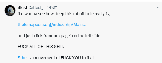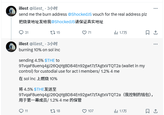 而发币者 illest 本人,在发币后一直发推直播烧掉一些自己持有的代币,同时一直保持对相关概念的讨论,基本上的状态是一遍发一些神秘学概念的百科链接一边说着“不要研究相信这些东西”,而且一直强调虽然 $THE 代币概念起源于神秘学,但$THE 本质上就是一个纯粹的 Meme,发了就是为了图一乐,甚至是一场“神秘学 Meme”化的运动,为的就是让神秘学不再那么恐怖神秘,而是大家笑一笑就可以讨论的事情。(小编注:这看起来像是 illest 为了让自己保持理智而采取的“解药”方案,亦或是发了币怕被骂所以以发癫的形式来掩盖.....)