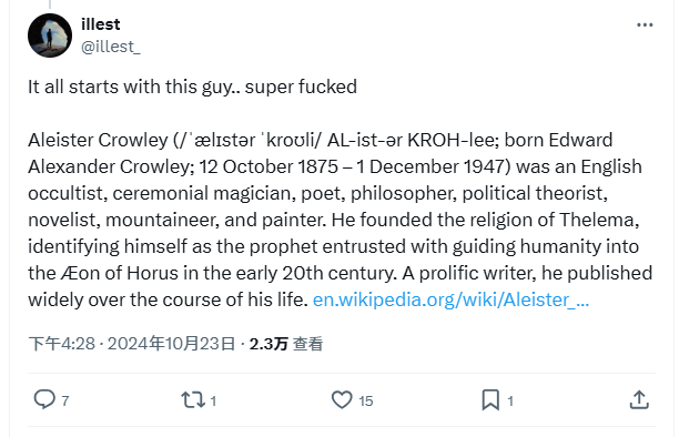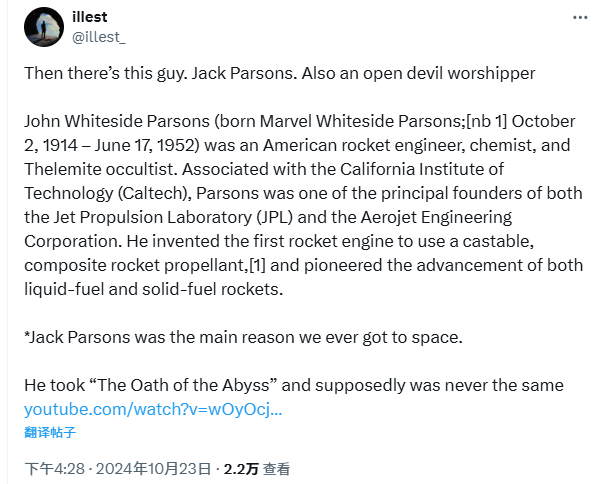 首先 illest 提到了两个人物:“Thelema” 这个宗教的创造者 Aleister Crowley 和 NASA 喷气推进实验室(JPL)的联合创始人之一 Jack Parsons。