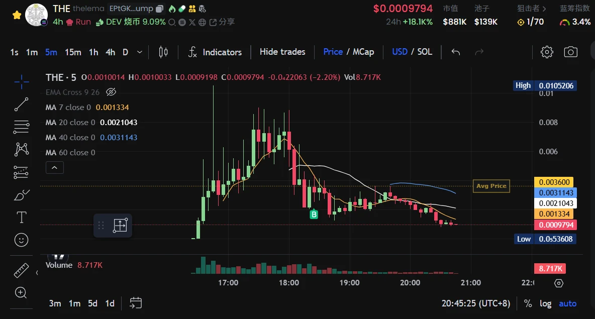 就在撰稿期间,市场玩家似乎不怎么吃过于抽象的这套,$THE 已经朝着不妙的方向走去。当前市值不到一百万美元,市值最高接近千万美元。
