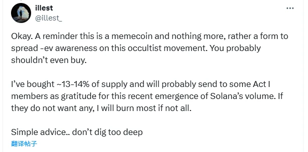 最后叽里咕噜说了一堆构想、贴了一堆链接后,illest 再次贴出免责声明:提醒一下,这只是一个 Meme 币,仅此而已,更确切地说是一种传播这个神秘主义运动负面意识的形式,你可能甚至不应该购买。并称自己已经买入了大约 13-14% 的供应量,可能会将其中一些发送给 Act I 的成员,以表达对最近 Solana 交易量增长的感谢,如果他们不想要,他会自己烧掉大部分。同时再次提醒不要对这些神秘学的东西研究太深,保护自己的 san 值。