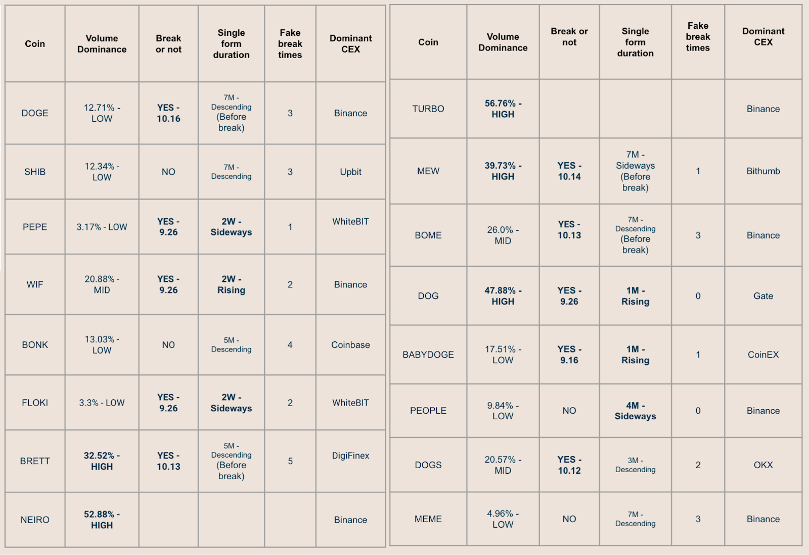 排名前 200 的代币中,除了 Murad 推荐的 5 个之外,剩下的 Memecoin 的主要流动性都在交易所里。而在这个周期中,交易所中的 Memecoin 走势也不尽相同。根据流动性主宰率和单一形态维持时间长短,能够提示突破后是否能出现强势的价格表现,这种价格表现和链上 Memecoin 相比,哪边更强势?
