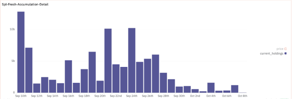 聚焦于小型持仓,我们可以看到从 9 月 16 日开始,地址数量由于新地址激增而飙升。随着 FOMO 效应加剧,小型持仓的自然增长进一步加速,在 20 日达到峰值。当团队观察到这种稳定的自然增长后,就移除了在 16 日至 18 日之间投放的 bot 地址。随着 $MOODENG 价格在 28 日达到峰值,地址数量开始下降,和价格走势同步。