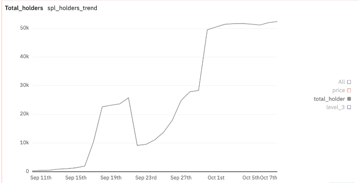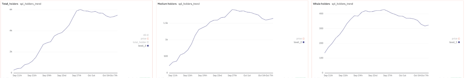 前者指的是团队 / 巨鲸 / 社区在价格下跌时维护价格、形成一段长时间的平稳的盘整形态、在需要突破时强势推动价格的能力。对于 Memecoin 而言,单靠用户情绪很难持续推动价格上涨,因为没有人能控制散户的买卖行为。因此,对于团队来说,吸引大持有者或零售交易者最终取决于他们自身在代币上的价格行为,尤其是在下跌和突破期间。因此,团队 / 巨鲸筹码的集中程度在某种层面上暗示了在关键价格节点时,团队采取行动的意愿以及决心。当然这个过程中也离不开社区的支持,比如 $SPX 的价格走势和团队行动并不强相关,这是源于 Murad 的影响力。后者能从用户持仓人数的增加情况来分析,同时观察头部持仓的变化可以指导我们卖出的时机。