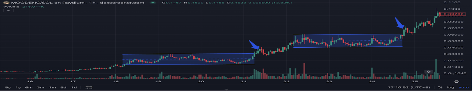 当我们对链上地址持仓水平做一个简单的筛选,可以发现,上述异常地址数的 $MOODENG 持仓数均小于 100 个。团队在自然增长没有预想活跃的情况下,三天内快速、大量、线形地投放了近 2 万个地址,让 $MOODENG 的链上指标触发扫链机器人的报警指标,同时在价格上维持稳定的上升通道,吸引市场关注。