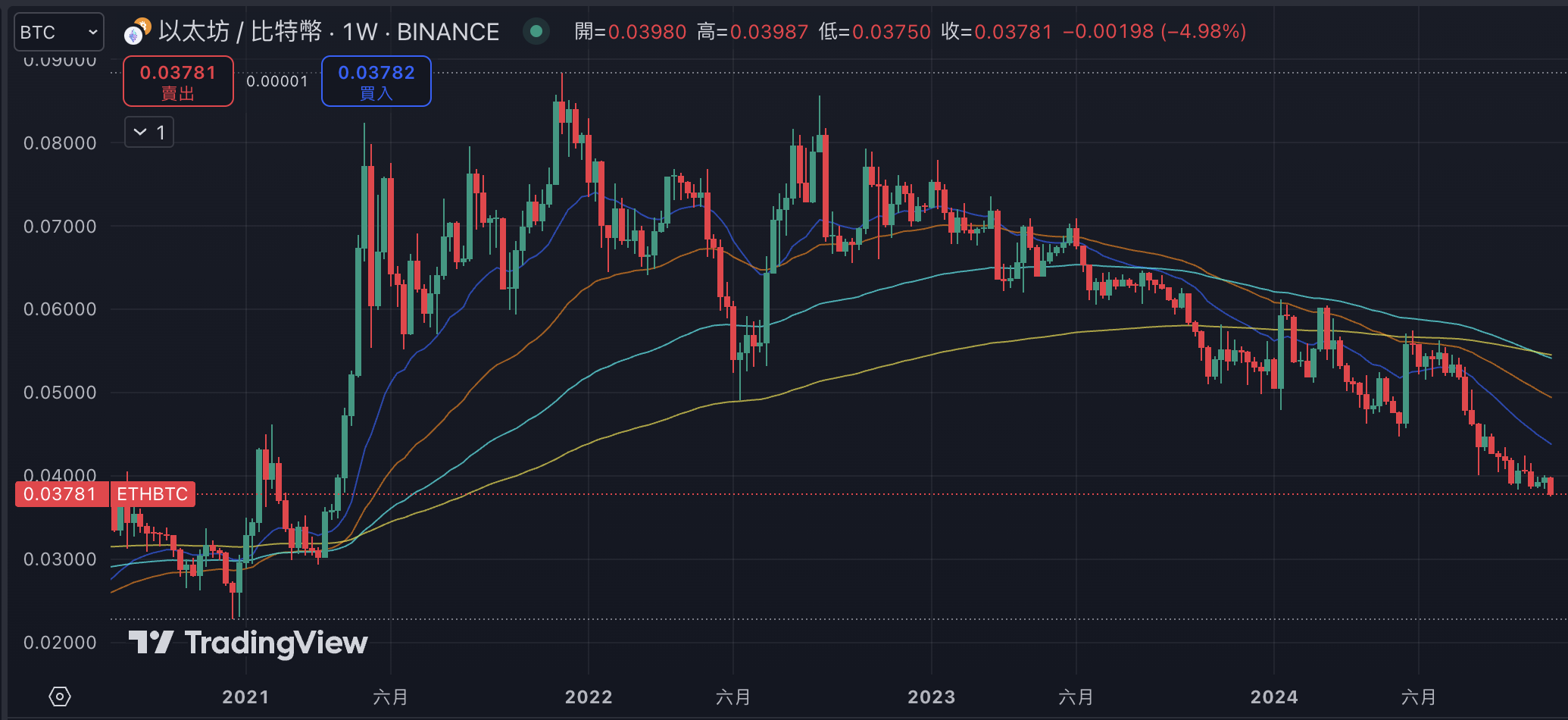 随着 ETH/BTC 汇率下跌到 2021 年 4 月以来的新低 0.0377。