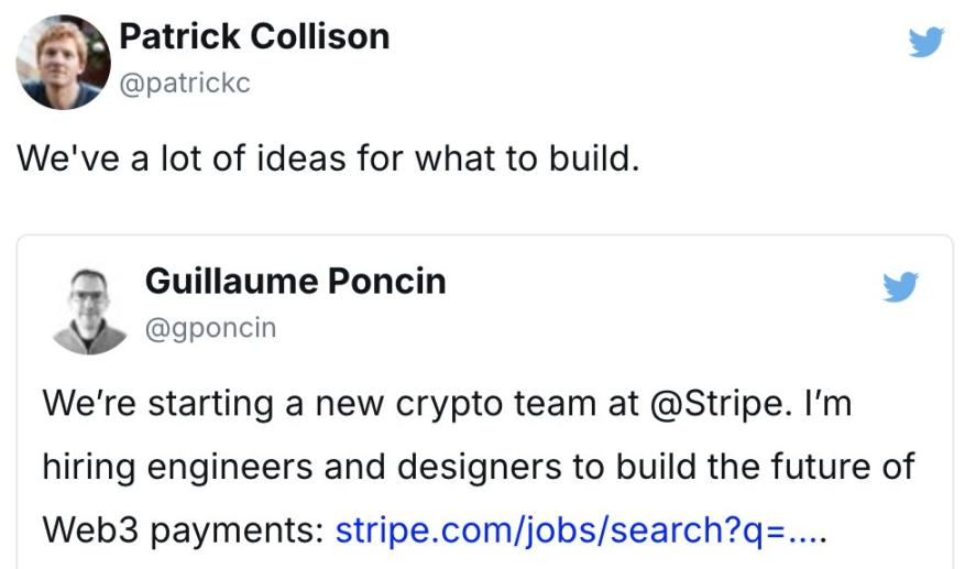 那么,我为什么要提起这件事呢?因为现在推特上充斥着因 Stripe 以 11 亿美元收购 Bridge 的喜悦。