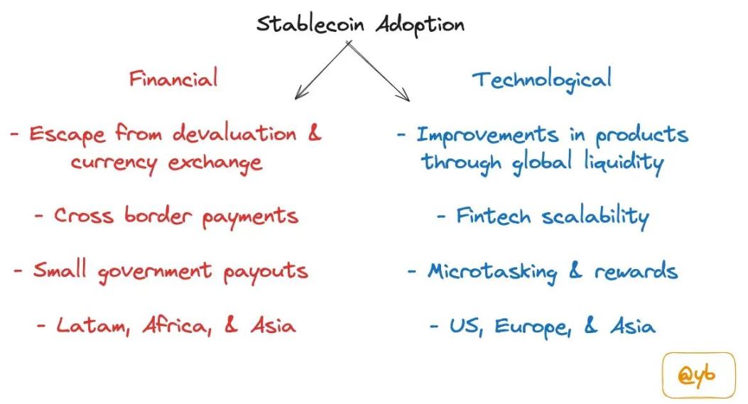 稳定币生态系统的规模远不止取代金融科技支付服务。正如我在稳定币采用的 文章 中所提到,这是一种双管齐下的方法。一方面,致力于改善现有的金融轨道,另一方面则使用稳定币来增强加密货币产品,例如 Polymarket、Bountycaster、Uniswap、Aave 等。