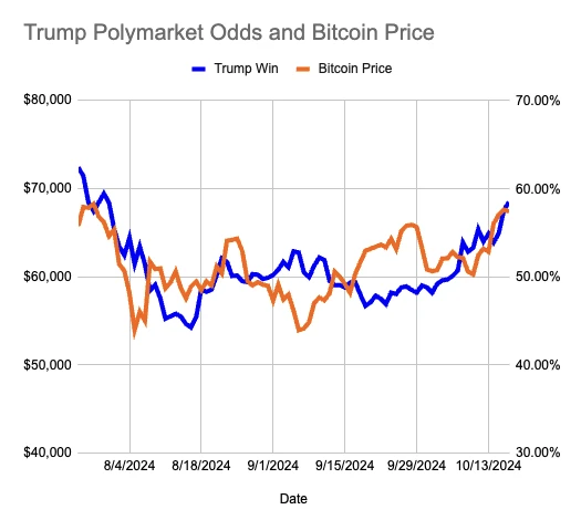 此前 Monad 增长负责人 Intern 曾 发文表示 ,Polymarket 上特朗普胜率曲线与比特币价格走势呈高度正相关性。