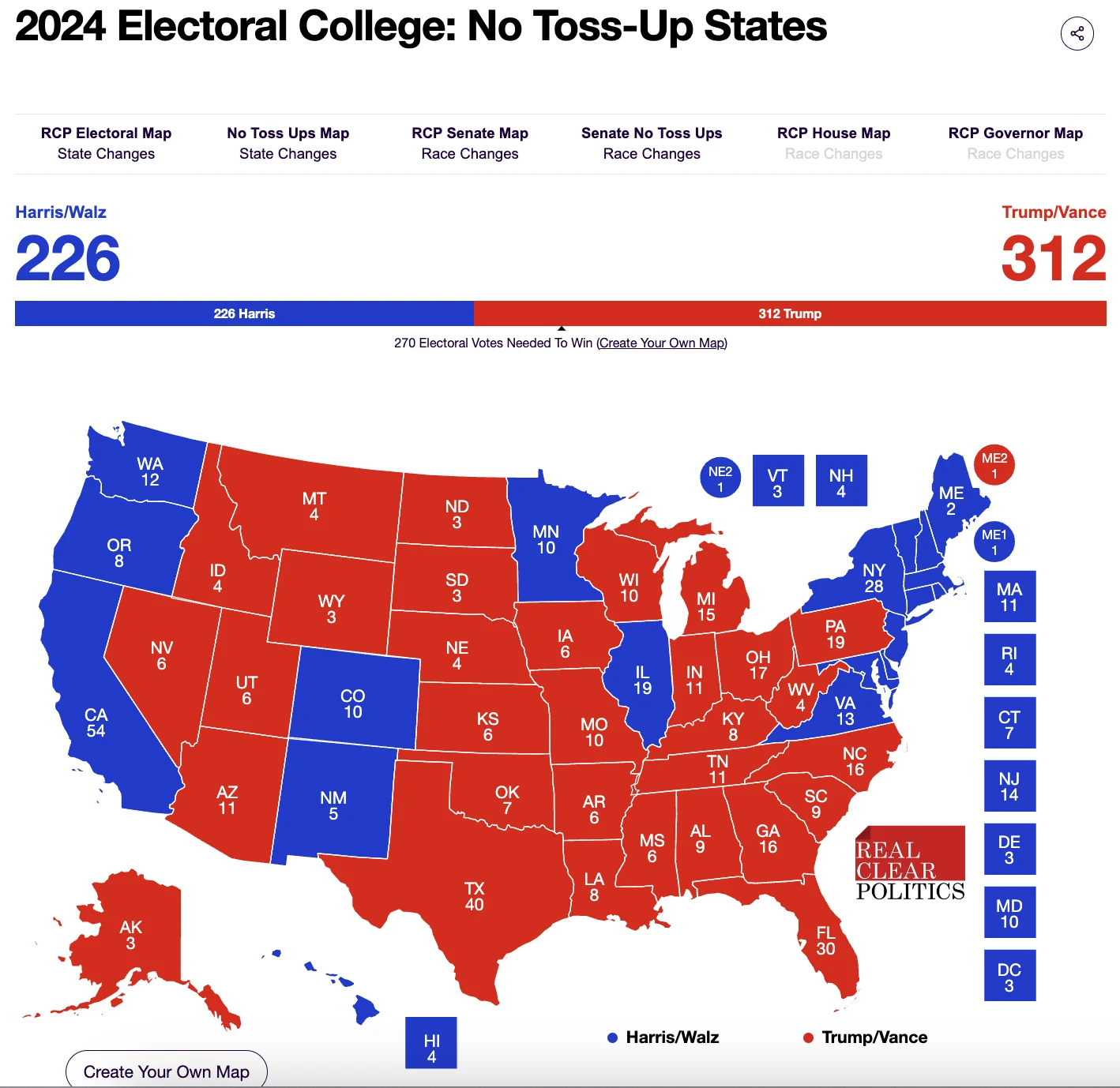 而根据美国知名政治选举网站 RCP 官网信息 来看,目前预测特朗普/万斯的精选组合有望拿到更多摇摆州的关键选票,最终或将获得 312 张选举人票,最终胜选。