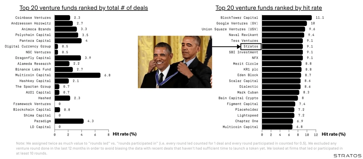 考虑到一些投资者比其他人更活跃,查看命中率也很重要。我们不仅使用了之前的数据,还考虑了每个投资者参与的交易总数,以找出命中率最高的。值得一提的是, @BlockTower 在这方面表现尤为突出!
