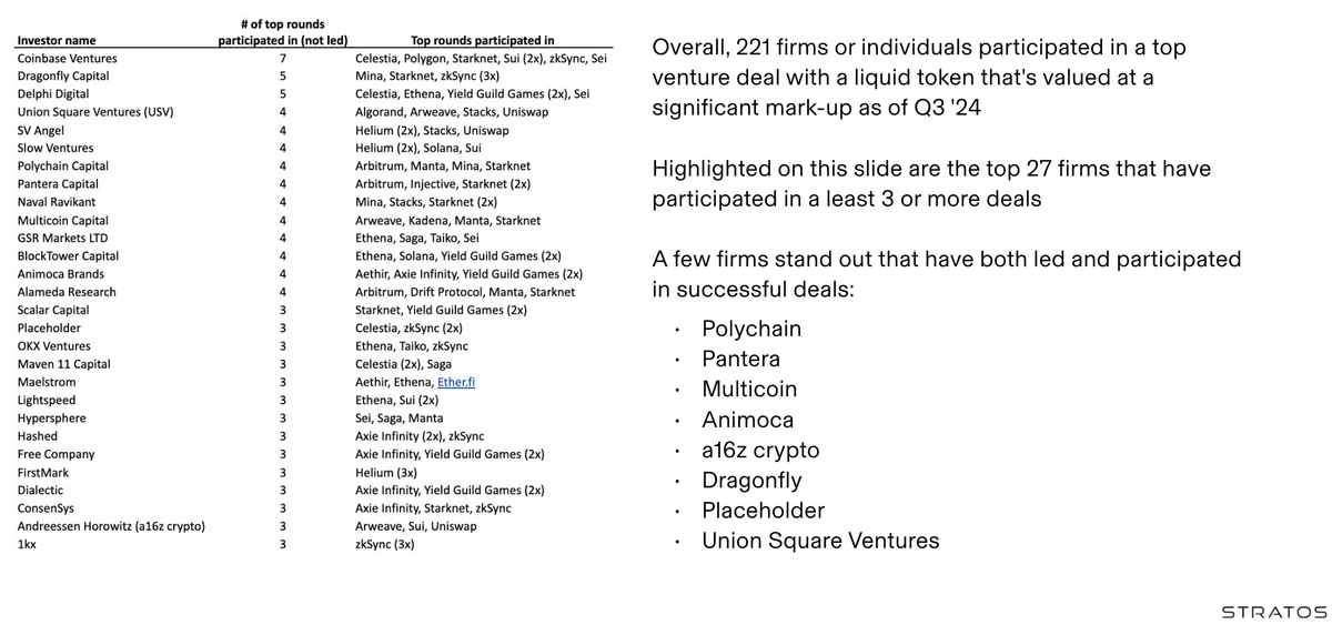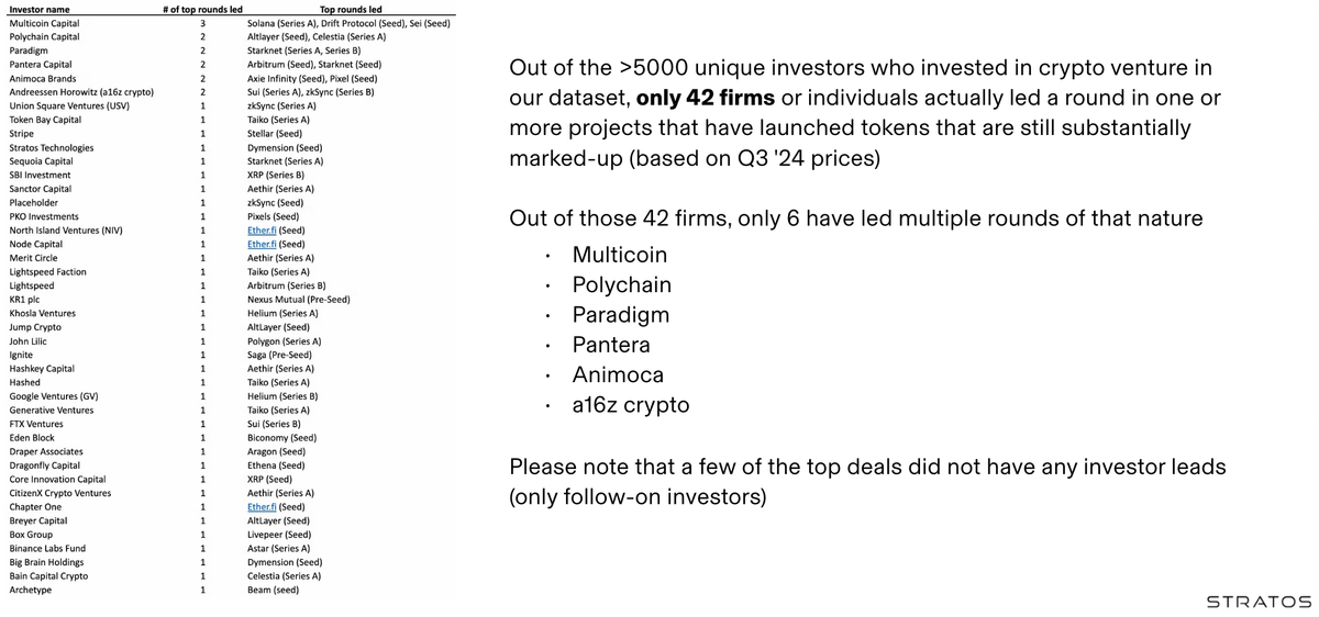 在我们数据集中,超过 5000 个独特的投资者中,只有 42 家公司或个人实际上领导了一轮或多轮项目,这些项目推出的代币在 2024 年第三季度价格基础上仍有显著增值。