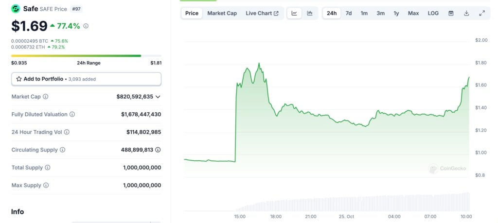 此次 $SAFE 也不例外,据 CoinGecko 数据 显示,在 Upbit 宣布将上架该代币后,$SAFE 从 0.935 美元迅速飙涨至最高 1.81 美元,昨晚回落调整后,稍早八点左右再次拉涨至逼近 1.7 美元,近 24 小时涨幅高达 77.4%。