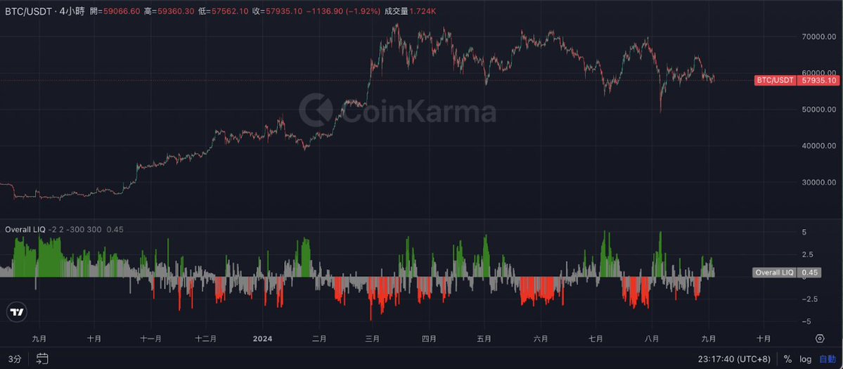 大家可以去看一下,因为之前我发一些推文的时候,大家都说我是马后炮。所以后来我就想,不然我就提前发一些预测。我就跟小编说,觉得 8 月 26 号下跌的几率挺高的,不如你发一篇文提醒一下。结果真的是准了。8 月 26 号的时候,比特币价格大概在 64000 左右,我们刚发文,两天后,也就是昨天,比特币就从 64000、 65000 跌到了 57000 ,是一个超过 10% 的修正。我最近其实比较少在社群上活跃了,因为忙着做自己的产品和交易。但那次特别想让大家知道,这个指标是有预测行情效果的。因为很多人都会说我事后才出来讲,所以我就想,不然就在我们感觉胜率比较高的时候,提前出来提醒大家,可能会涨,可能会跌。刚刚我发的那张图里,大家可以看到,其实在 57000、 58000 的时候,Overall LIQ 指标显示的是一个有立柱的状态,这通常是一个 local bottom 的信号。