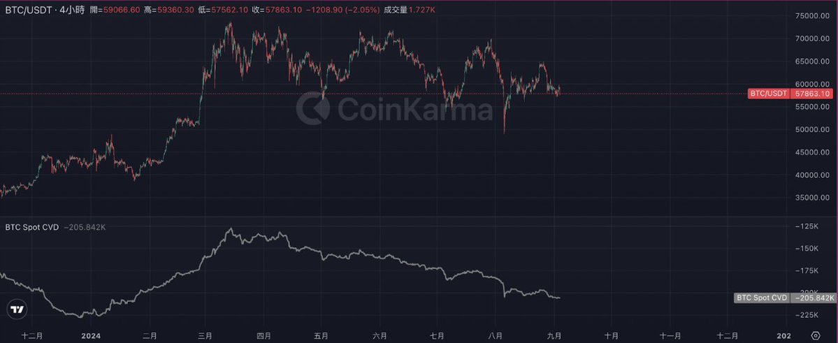 对,这样说吧,基本上如果你要突破一个很强的阻力,不可能仅靠内部资金拉上去。所以我们会看外部资金的状况。以今年为例,最明显的单边行情就是从一月底一路拉到 3 月中,大概持续了一个多月。那段时间,我们观察各大现货交易量较大的交易所,比如 Coinbase、Binance 和 Bitfinex,这些 dominant 交易所的市价买入强度都非常强。包括 BTC ETF 的 inflow,资金净流入量也是非常夸张的。只有在这种情况下,外部资金不断涌入,冲击市场,才能突破上方的卖压,形成单边行情。所以简单来说,如果你要判断这次会不会突破还是继续震荡,基本上就是看 BTC 的 inflow,还有我刚刚提到的那几家交易所的 CVD。