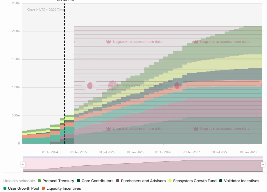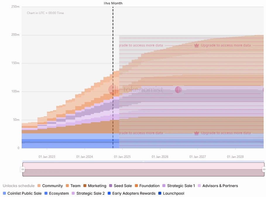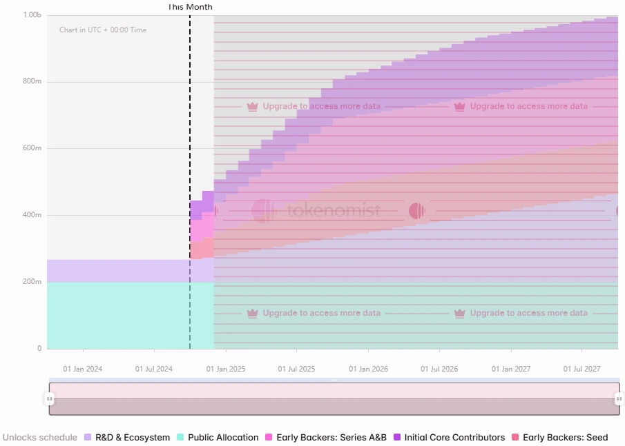 TIA 即将进入加速解锁时期,本轮解锁中 Cliff 解锁分别面向 A&B 轮融资 6491 万枚(3.47 亿美元)、初始核心贡献者 5821 万枚(3.11 亿美元)、种子轮融资 5247 万枚(2.8 亿美元)。此外将有每天 500 万美元的线性解锁。
