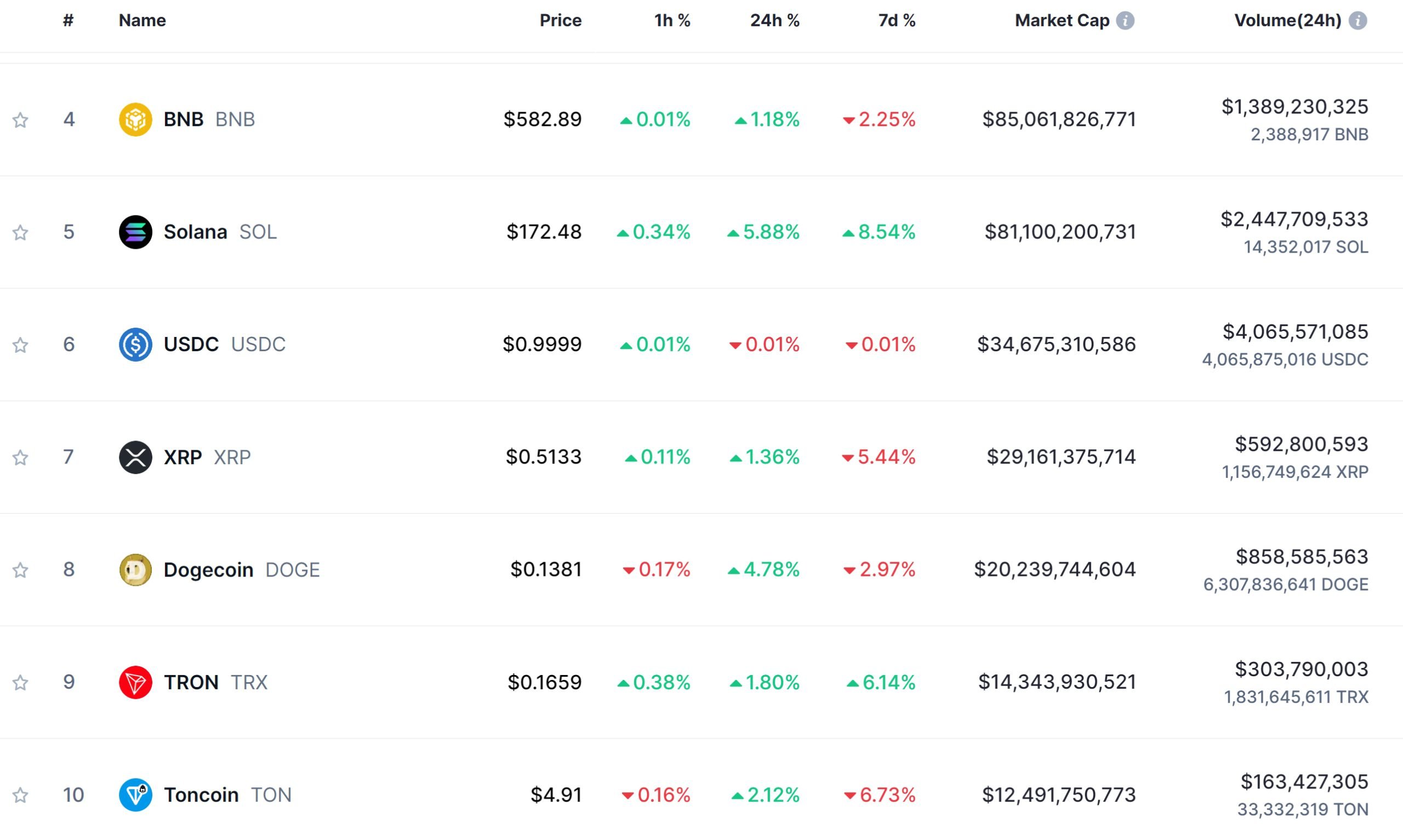 CoinMarkeCap 数据 显示 ,其他前十大代币近 24 小时全面回升,较为强势的 SOL 上扬 5.8% 至 172 美元,DOGE 上涨 4.78% 至 0.1381 美元,TON 则上涨 2.12% 至 4.91 美元。