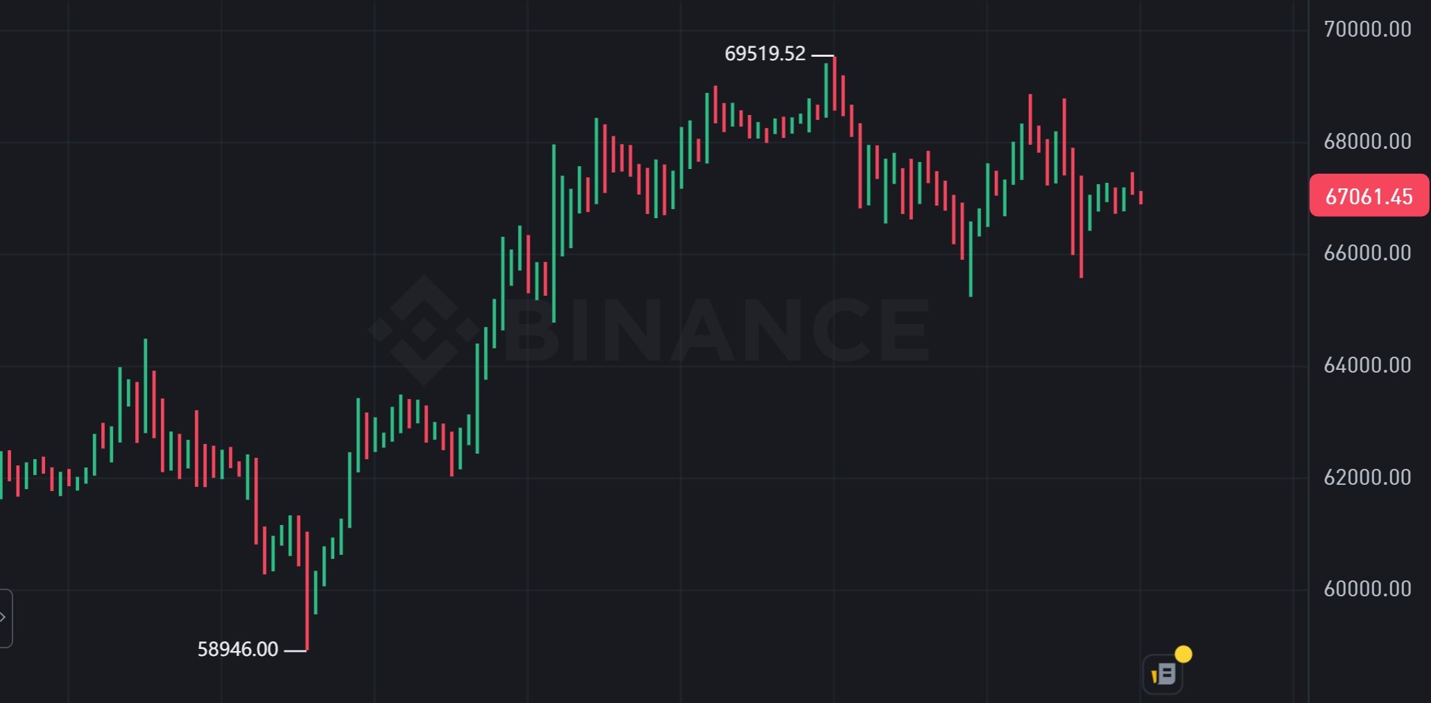 比 特币(BTC)在 25 日冲上 68,771 美元后突然 急杀 ,最深在 26 日清晨跌至 65596.29 美元,但随后拉回 6.6 万美元上方,近 2 日持续在 66600 美元至 67400 美元附近震盪,至截稿前,报 67061 美元,近 24 小时上涨 0.6%。