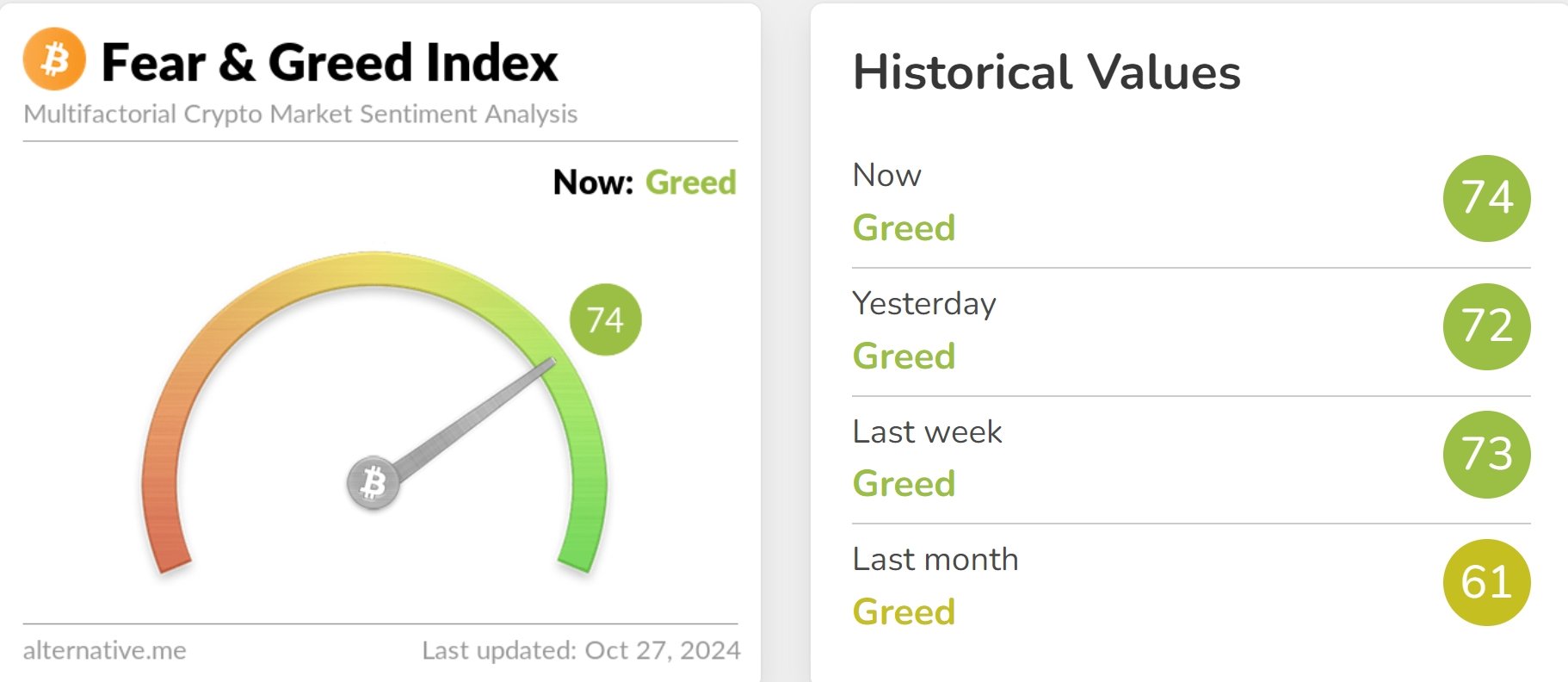 升至 74,已连续 12 日维持在贪婪等级,表明市场情绪持续高涨。