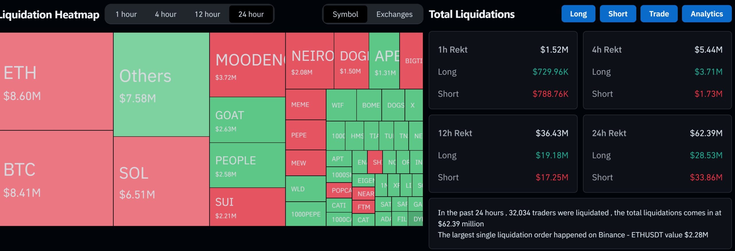 Coinglass 数据 显示,过去 24 小时,加密货币全网爆仓金额约 6200 万美元,其中,多头占 2820万美元,空头占 3386 万美元,有超过 3.18 万人遭清算,不过单日整体爆仓金额较 25 日的 4 亿美元已降低许多。