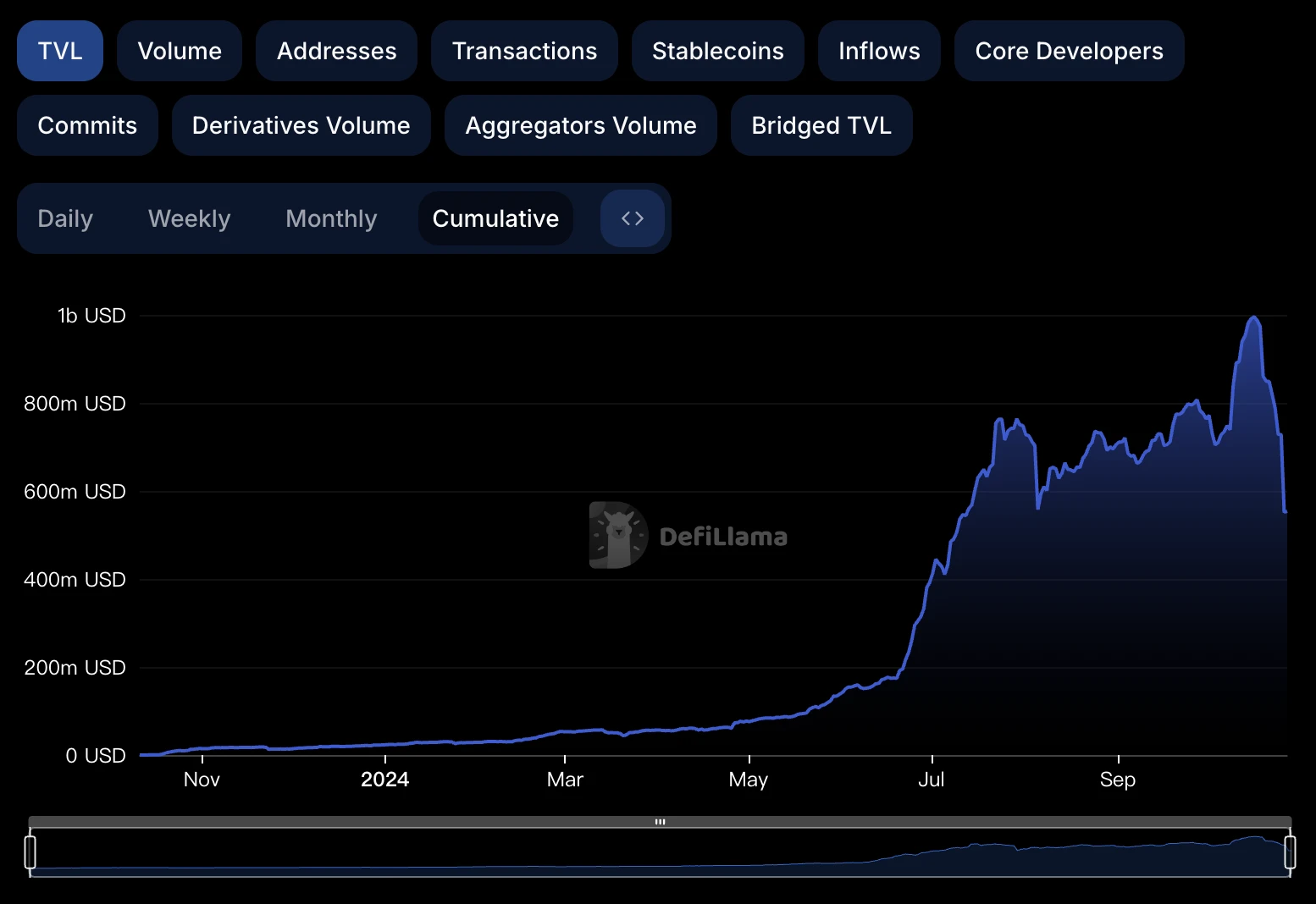 随着空投的尘埃落地,不出意外大量资金正在快速流出 Scroll。DeFillama 数据显示, Scroll 全网总锁仓价值(TVL)当前约为 5.5 亿美元,较 10 月 16 日(即空投快照前 3 天) 9.91 亿美元的历史峰值已缩水 44.6% ,接近腰斩。