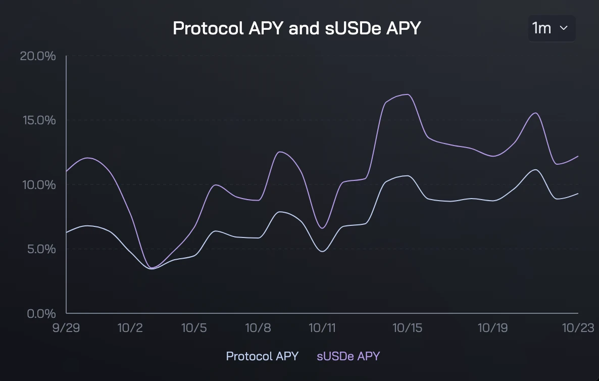 一个是 Ethena 的 sUSDe,即质押后的 USDe。随着资金费率的回升, sUSDe 本身的收益率已回升至 13% 。