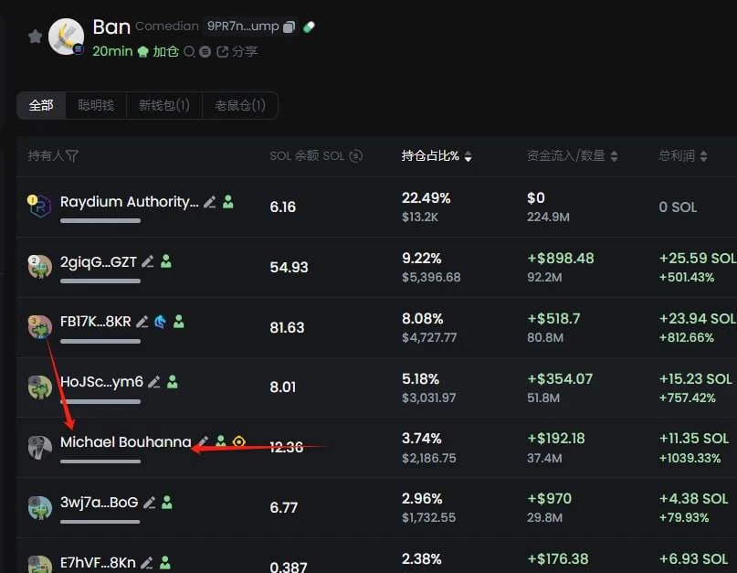 那这根香蕉怎么传染到 Meme 市场的?据小编的初印象,周五晚上十一点左右,有链上猎手提示 GMGN.AI 上显示 Solana 链上的香蕉概念币 $Ban 前排持仓之一是苏富比的副总裁 Michael Bouhanna( @michaelbouhanna ),该持仓占比占总量的 3.78% 。