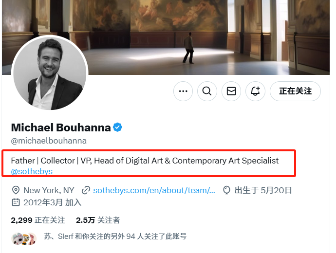 到了白天,币价还一度上涨至前高,只是没有利好刺激又逐渐回落。直到晚上八点左右,副总裁 Michael Bouhanna 在推特宣布以苏富比高层的身份出席币安大会。同时人们还发现苏富比公司的官方账号将头像换成了带有胶带香蕉元素的图片。