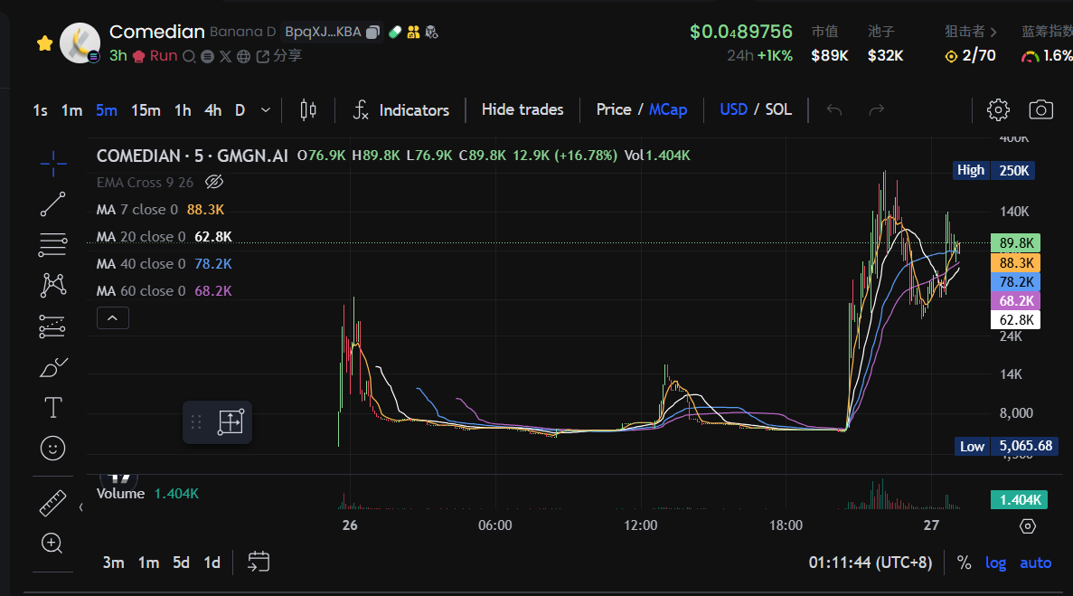 与龙一 $Ban 正好相反,这个代币以香蕉本名 Comedian 作为代币符号,角度看似正确,但从价格表现上看好像玩家们不太买单。