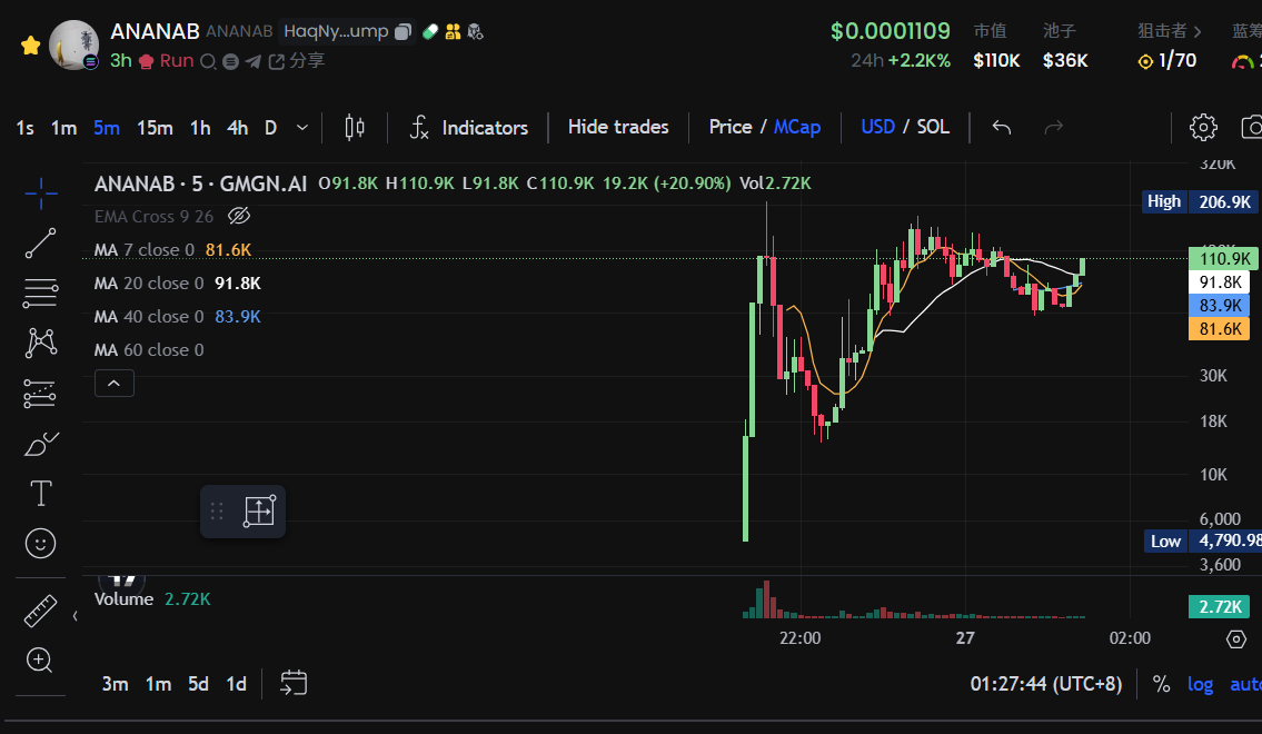 概念简单易懂,蹭的角度比较偏,而且价格表现也一般。且 GMGN.AI 显示跑路概率为 100% ,推测为 Dev 的蹭热点流水盘,仅供观察,不建议参与。