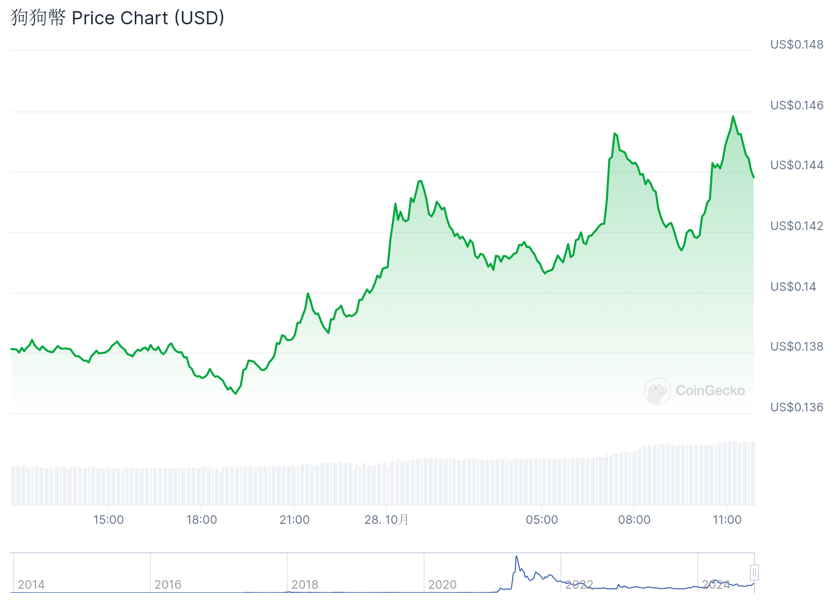 而或受马斯克推文影响,CoinGecko 数据 显示,今早 10 时起,狗狗币价格在 1 小时内上涨从 0.1418 美元上涨至 0.1458 美元高点,最大涨幅近 3%,随后略为回落,至截稿前,报 0.14306 美元,近 24 小时上涨 3.44%。