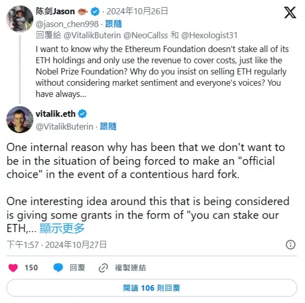 当被问及为什么以太坊基金会不将其全部的 ETH 持仓用于质押,并透过质押收益来支付开销,而非直接出售 ETH 时,Vitalik Buterin 解释,以太坊基金会希望避免在有争议硬分叉发生的情况下,被迫做出「官方选择」。