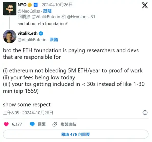 「以太坊不再因 PoW 机制而每年增发 500 万枚 ETH,用户如今使用以太坊的费用很低,用户的以太坊交易能够在 30 秒内完成,而非 1-30 分钟(因为 EIP-1559)。请放尊重点。」