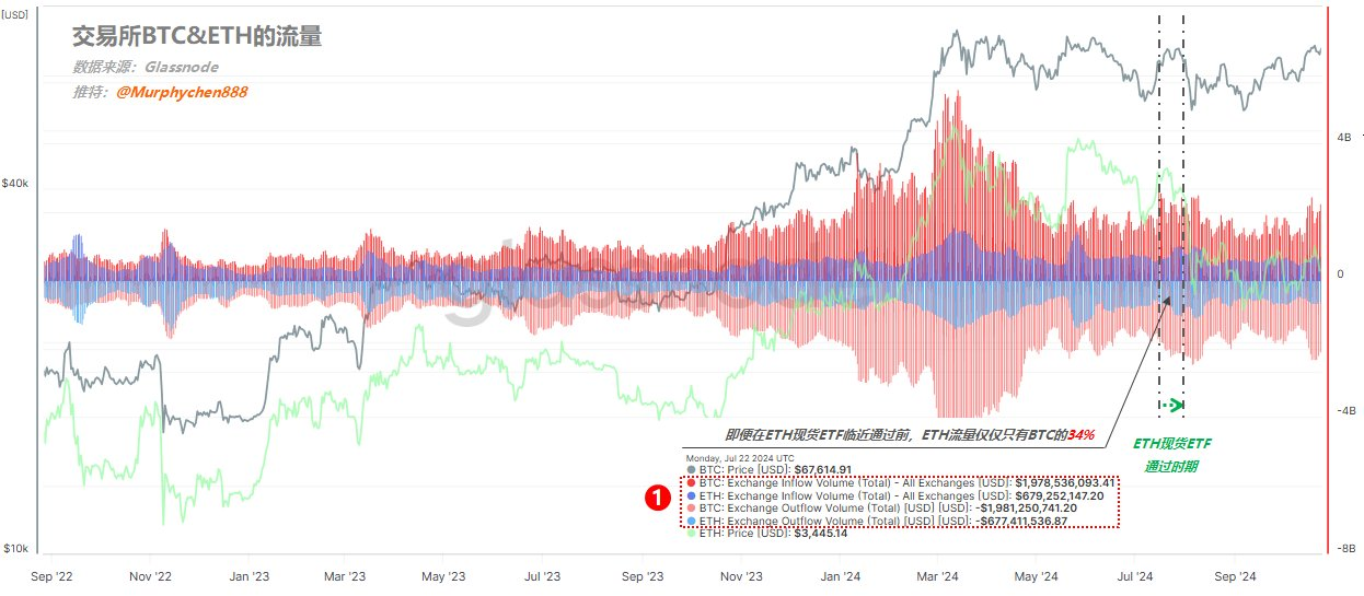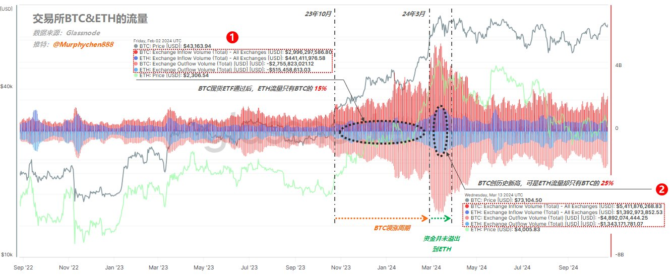 进入 3 月,BTC 价格突破$73,000 的历史高点,此时 #ETH 虽然也同步跟涨,但 ETH 交易所流量对比 #BTC 的并没有明显改善,就像我截图在 3 月 13 日这天(见图 4 中标注 2),BTC 流入 54 亿,流出 49 亿;ETH 流入 14 亿,流出 13 亿; 即便在市场最 fomo 的时候,ETH 的交易所流量也只有 BTC 的 25% 左右 。