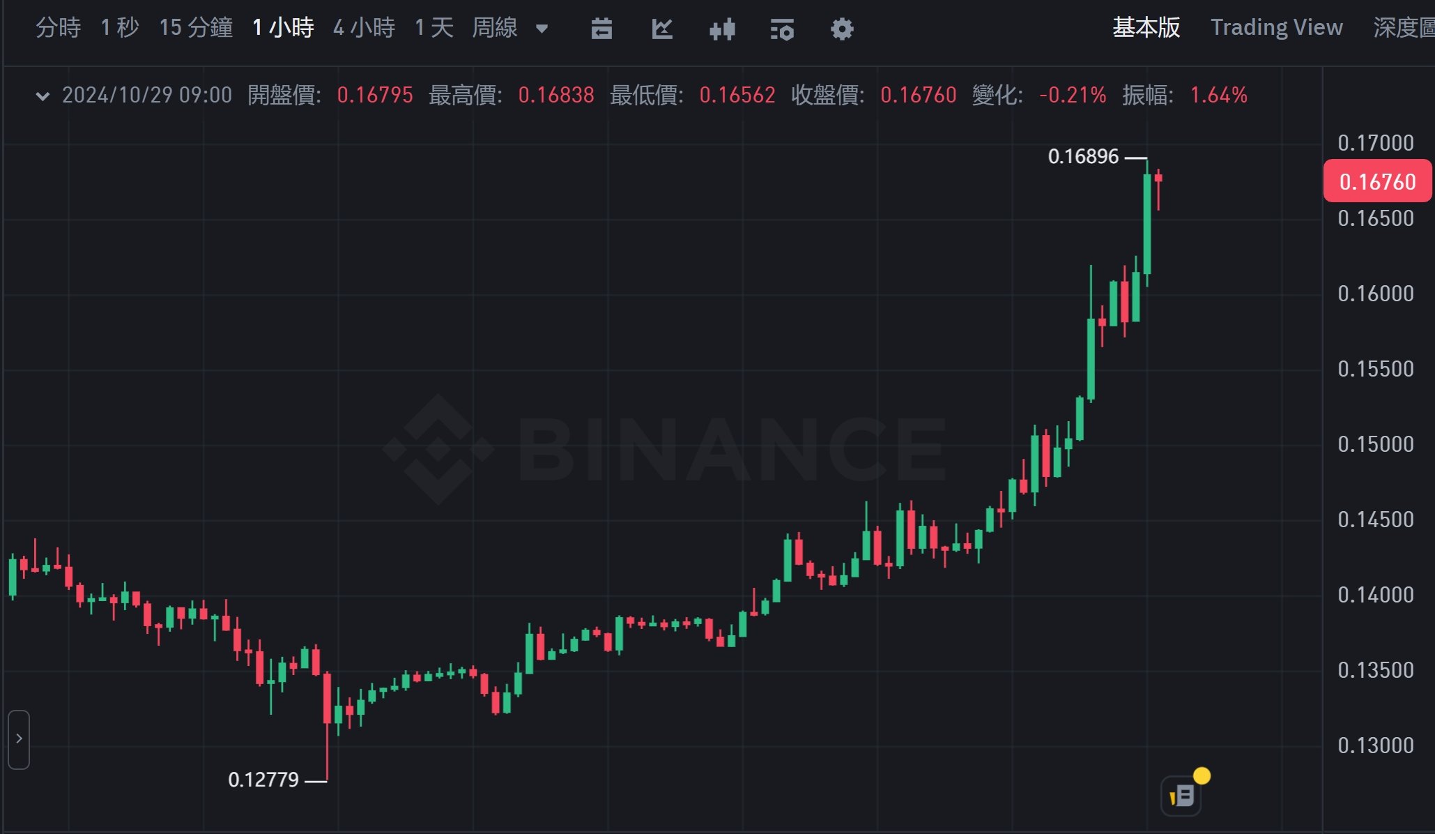或许是受川普当选机率攀升,马斯克又再度喊盘狗狗币的刺激,狗狗币价格近 24 小时大涨 17.7% 至 0.1676 美元,创下自今年 5 月来新高,且在前百大市值加密货币中单日涨幅最高。