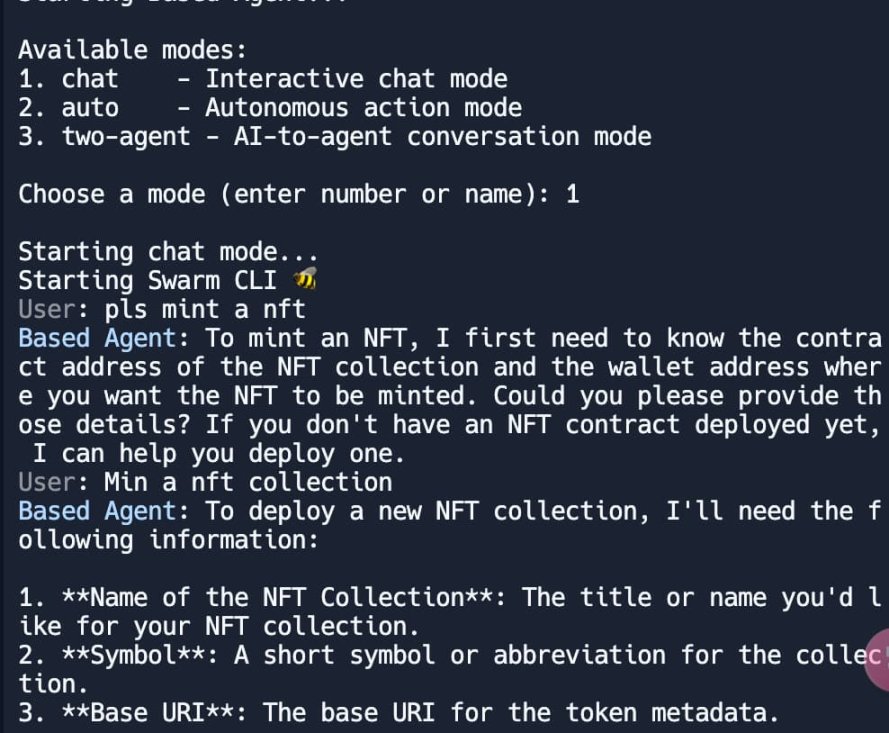 其中,聊天模式中,我们可以用自然语言去沟通,比如,让该 AI 代理去执行铸造 NFT 系列、兑换代币等操作,不过由于该代理目前仅支持 Base Sepolia 网络,所以笔者尝试的多个操作这个代理还不能够完成。