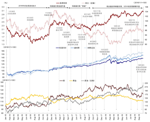 此处可借鉴2016的美国大选,当时市场也触发了特朗普交易,尤其是在2016年11月胜选后,乐观预期陡然上升。美债利率在一个月内从1.7%到2.6%,美元指数也由97突破103。从美股来看,三大指数在此期间涨幅10%,再看大宗商品,通胀预期推动铜和原油大涨,黄金逆转,大选后一个月内下跌3%。