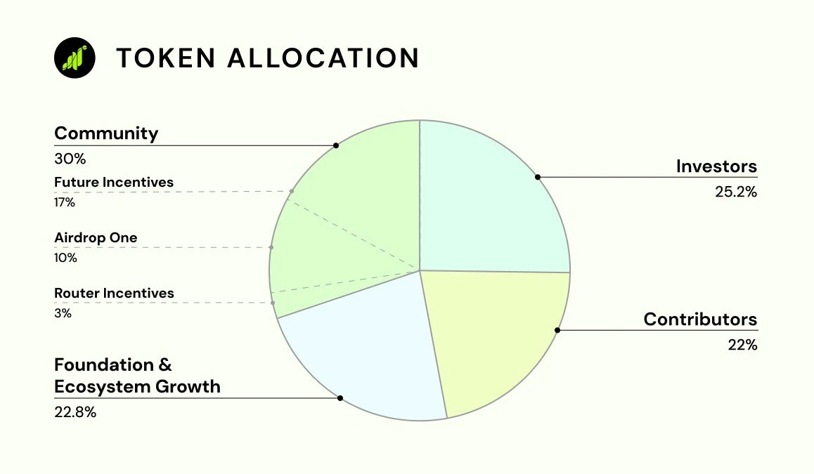 社区:占代币总供应量的 30%, 为 3 亿枚,其中本次空投申领的部分为 Airdrop One,占代币总供应量的 10%, 为 1 亿枚;Future Incentives(未来代币激励)占 17%, 为 1.7 亿枚;Rounter incentives 占 3%, 为 3000 万枚;