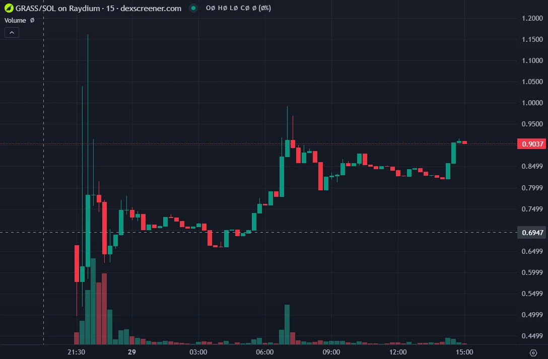 由于 Grass 代币并没有如社区预期的上线币安,甚至 OKX 也仅仅上线合约而非现货。因此,“领到币就砸盘”的情绪在社区中蔓延, 根据行情显示(GRASS 代币合约地址:Grass7B4RdKfBCjTKgSqnXkqjwiGvQyFbuSCUJr3XXjs),GRASS 代币刚开始申领时,代币从开盘 0.66 美元一度跌破 0.5 美元,可以看出“撸毛党”没有一丝犹豫的领到币就砸盘。不过,随后出现大量买盘,GRASS 价格一度突破 0.9 美元,较低点涨幅超 80%。 尽管凌晨出现“第二轮砸盘”,但 GRASS 价格很快又被拉升,目前价格暂报 0.904 美元。