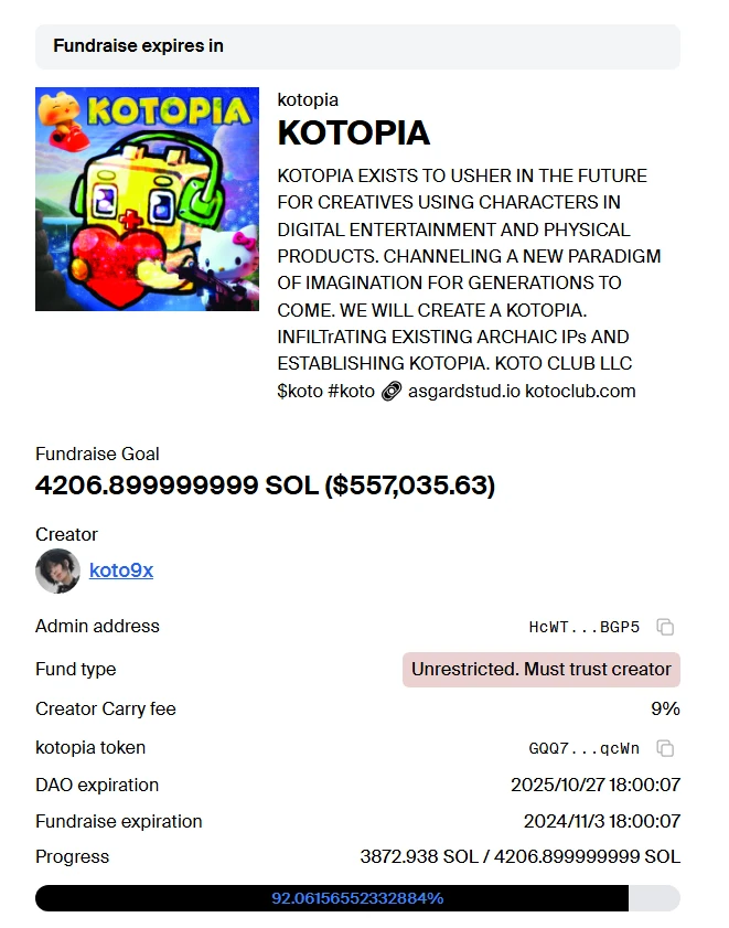 艺术家 Koto 本人发布的代币,预售 4200 sol 很快被打满。价格在冲高破 16 M 后回落,目前市值在 3.4 M 左右。