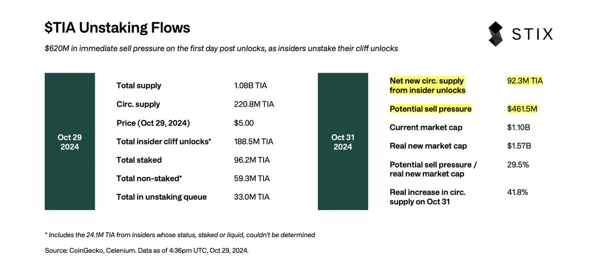 这张图概述了 2024 年 10 月 31 日 Celestia(TIA)的新增流通情况,我将在下文中解释这些数据。