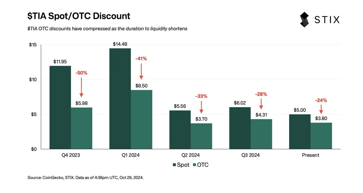 2024 年第三季度和第四季度,TIA 的 OTC 交易非常活跃,卖家们在积极抛售各种份额,包括首期解锁份额以及后续所有份额。 在 STIX 上,七月以来 TIA 的 OTC 交易量约为 6000 万美元,假设 STIX 占据了 75% 的 OTC 市场份额,这可能表明通过各种 OTC 流动性渠道完成的 TIA 换手规模超过 8000 万美元。