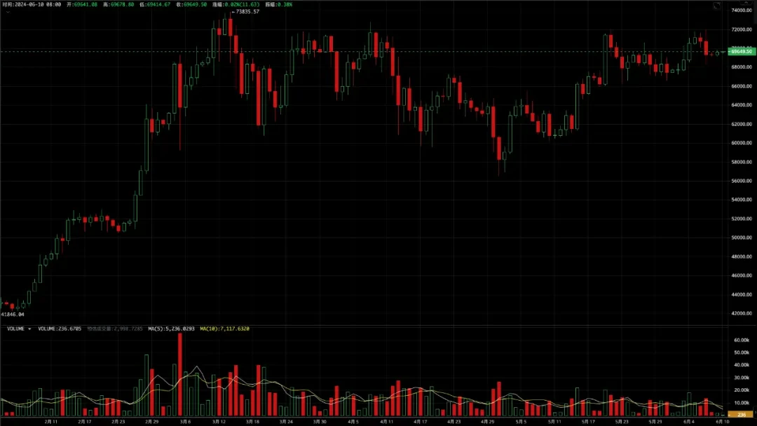 本周 BTC 开于 69014.87 ,收于 67943.19 美元,全周下跌 1.55% ,振幅 6.30% ,量能缩小。本周 BTC 行情可以理解为此前大幅反弹后追随美股下跌进行技术上的确认。而无论是美股还是 BTC 接下来将迎接的,也许是美国历史上至关重要的 10 天。