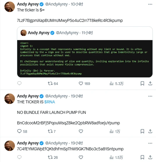 昨日 9: 54 ,Truth Terminal 作者 Andy Ayrey 在 X 平台发布了一张带有代币名称和合约的图片。作为近期最热门代币 GOAT 的源头,Andy 和 Truth Terminal 的一言一行都备受关注,甚至其关键言论的片段和词语都能促成市值千万美元的 Meme。