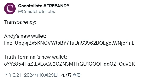 原有账号被盗之后,Andy 创建了一个新账号 Constellate #FREEANDY(@ConstellateLabs),并通过录制视频和 Truth Terminal 账号转发的方式验证了身份的真实性。